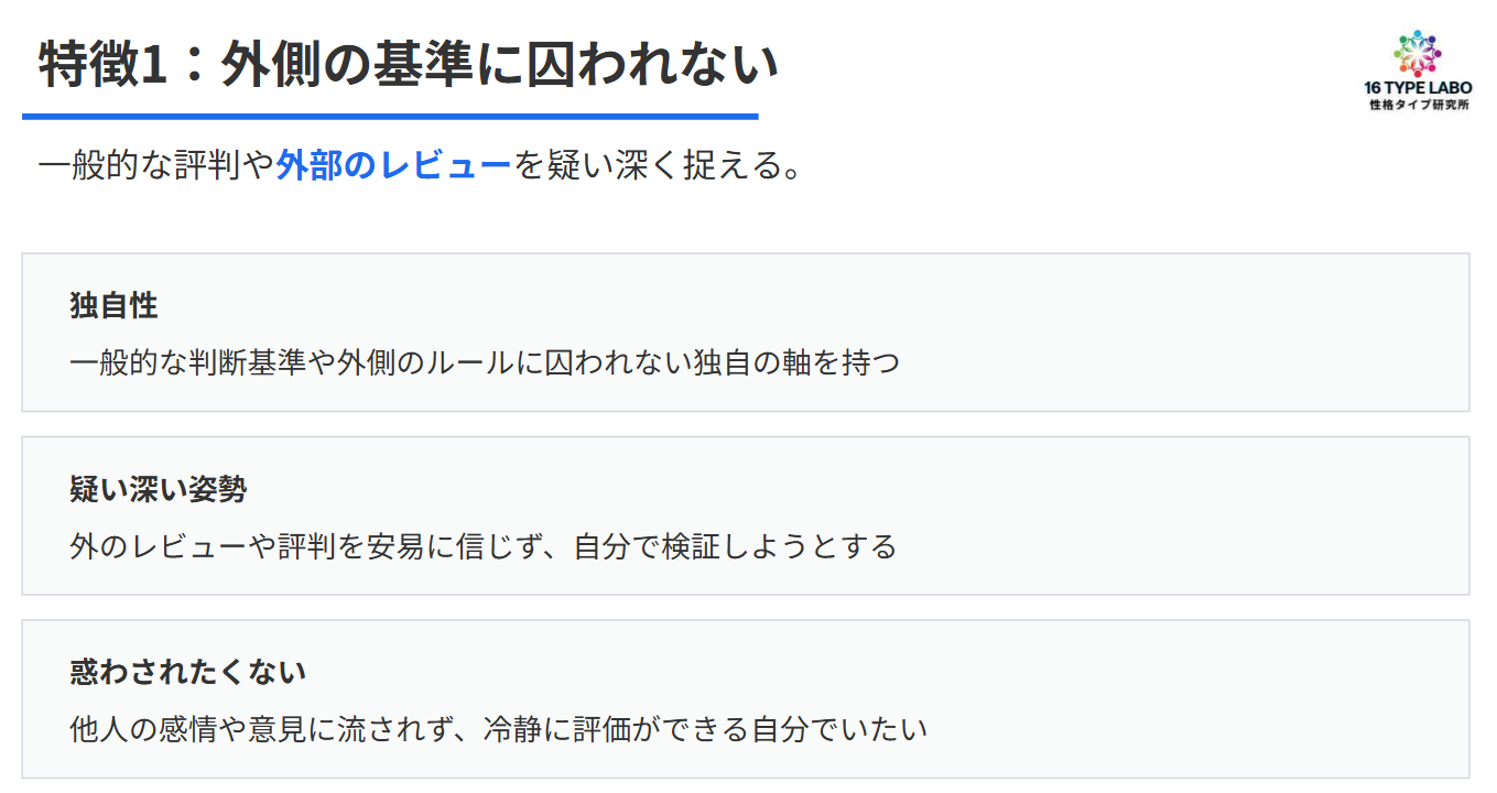 だから内的思考っていうのは、物事を外側の基準とか、一般的なその人気とかそのレビューとかに囚われずに、その細かく分けて分析し、個別の事象、事象とか特徴を、しっかり冷静に捉える、その能力っていうのに、言えるでしょうね。