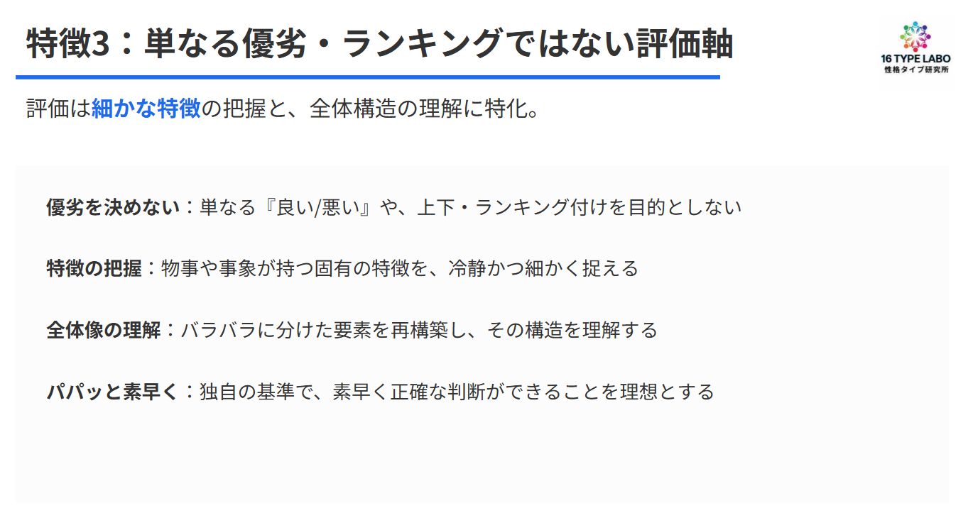 僕はINTP、TPタイプなんですけど。結構16タイプこの話とかしているんですけど、結構独自の基準っていうか、見て話していると思うんです。