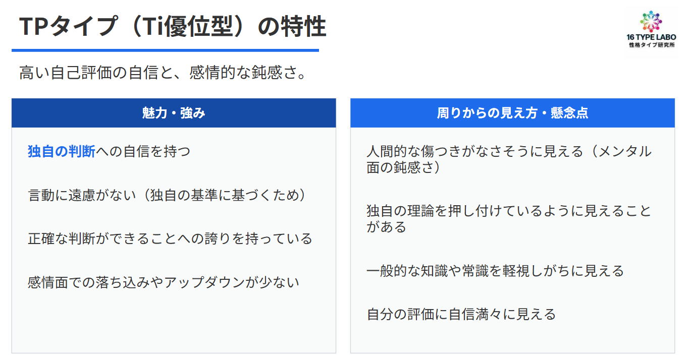 TPタイプの機能なんですよね、これ。だからこのTPの人は、特にその初めて16タイプの診断やって、なんとかTPって出てきたって人、特に注目して聞いてほしいんです。