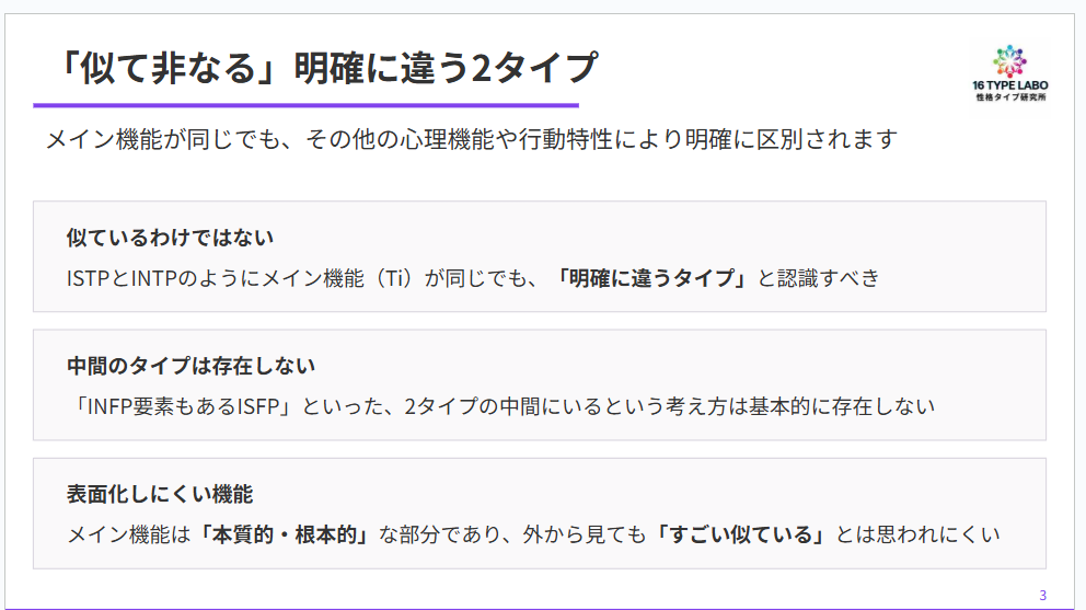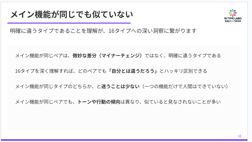 初めて16タイプを学ぶ方や、勉強し始めたばかりの方は特に、「メイン機能が同じだから似ているはず」と思いがちです。でも実際には、明確に違うタイプなんだということを、まず理解しておいてくださいね。