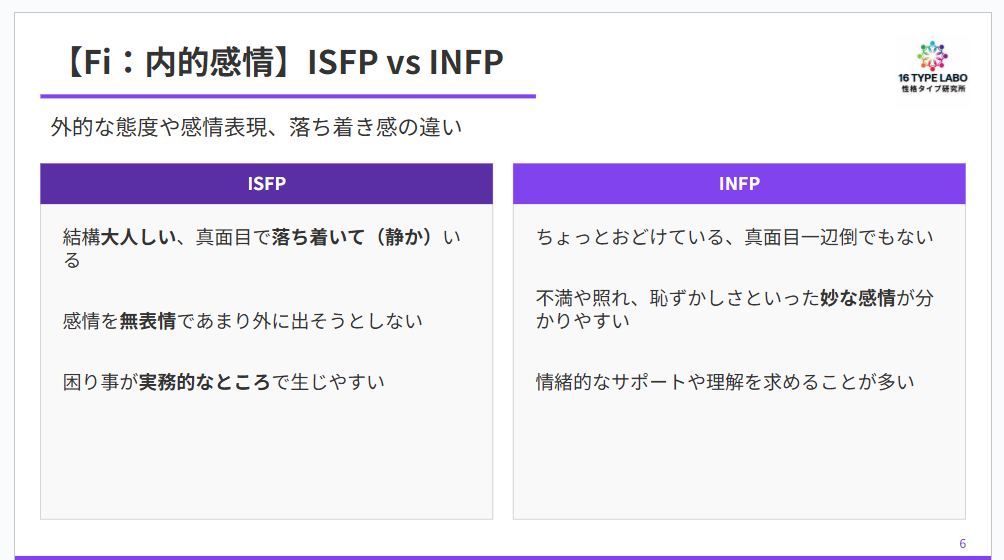 ISFPとINFPも、だいぶ違いますよ。両方とも内的感情(Fi)がメイン機能なのですが、印象がかなり異なります。