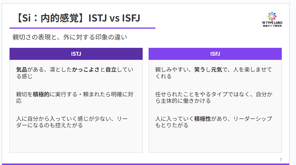 助けてくれるところが違うんですよね。ISFJの方は、もっと人を楽しませてくれたり、笑わせてくれたり、人の中に入っていく感じです。ISTJと比べて、ISFJの方が笑うし元気だし、親しみやすい感じがありますね。