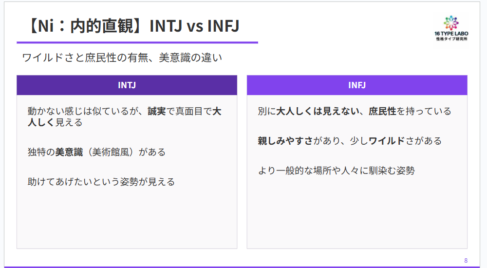 INFJには親しみやすさがあって、庶民的なんですよ。庶民性を持っていると思っていいですね。だから親しみやすさがあって、ちょっとワイルドな感じもある。INTJの方が、なんというか、独特の美意識というか、美術的な雰囲気があるんです。INFJは庶民的で、INTJは美術館みたいな感じ、と言ったらいいでしょうか。