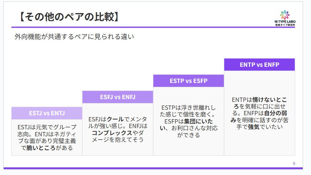 ESTPとESFPも、これまただいぶ違うんですよ。パッと見た雰囲気も含めて、かなり異なります。